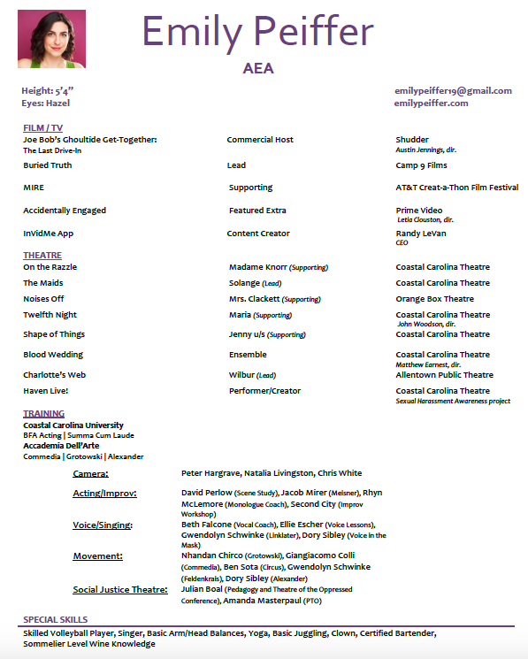 Performance Reel Physical Theatre Reel “Appropriate” Scene “Rabbit Hole” Monologue “Girlboss” Monologue “Mary Jane” Monologue “passing by” Movement Piece “A Grand Proposal” Short Joe Bob Briggs: The Last Drive-In “Searching” Scene “Buried Truth” Scene “MIRE” Scene Headshot Resume